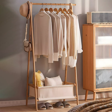 ハンガーラック シンプルデザイン ナチュラルテイスト 折り畳み式 コンパクト 省スペース 天然木 収納ポケット 大サイズ対応可能 ナチュラル YMJ-006
