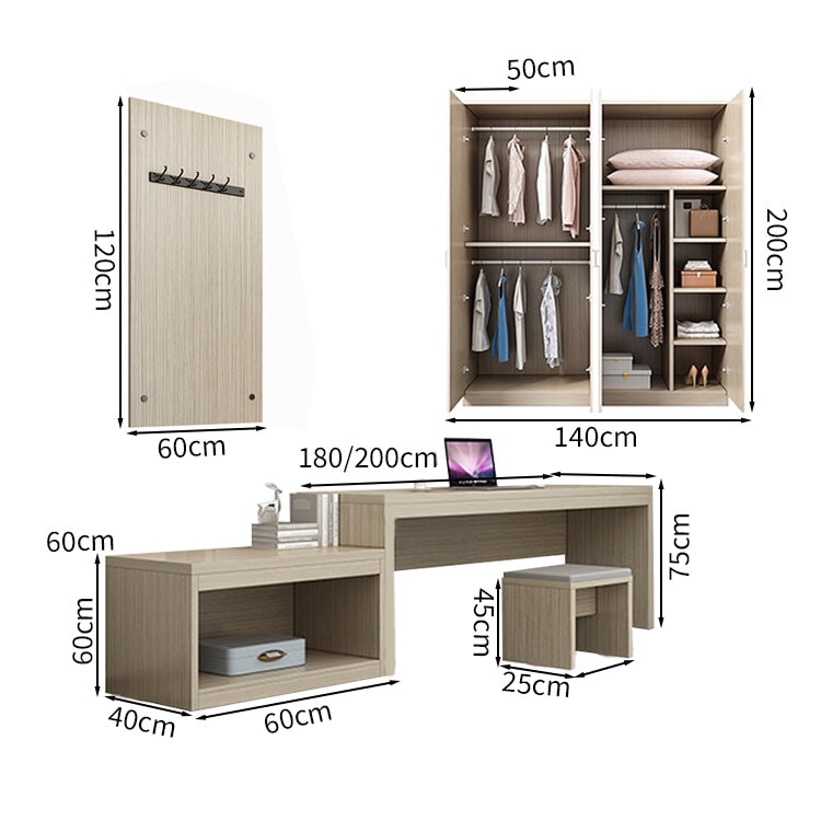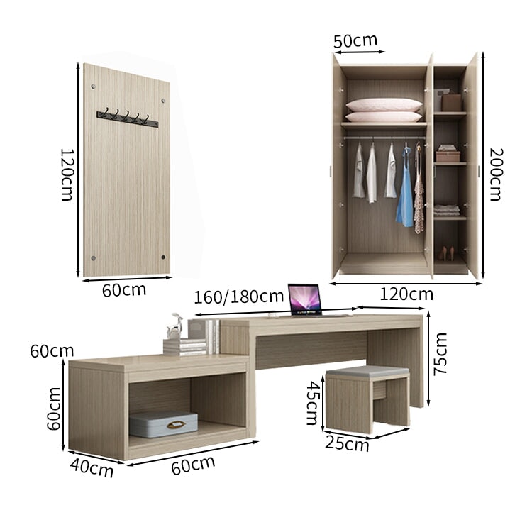 素材 メラミン化粧板 カラー ホワイト、ナチュラル+ホワイト 重量 40~100kg サイズ 180*40*75cm、220*60*75cm、240*60*75cm、260*60*75cm、160*60*75cm、180*60*75cm、200*60*75cm、120*40*200cm、50*40*50cm、 組み立て 必要 カスタマイズ 可能 カスタマイズ項目 サイズ 商品説明 クラシックデザインのホテル家具 高級感あふれるデザインが特徴で、客室に洗練された美しさを加えます。クラシックな要素と現代的なスタイルが見事に融合し、どんなインテリアにも調和します。 広い机上スペース 卓上を広く使える、余裕を持って作業を進められます。 チェア付き ウレタンフォームを充填、快適な心地を体感できます。 収納スペース 用途に合わせて自由に配置できます。 イメージ サイズ...