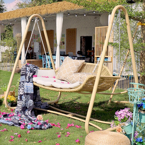 ブランコ ハンギングチェア ナチュラルテイスト ポリエチレン ロープ張り アルミ合金 スチールフレーム パウダーコーティング 粉末塗装 シリコンフィルクッション HWYZ-M006